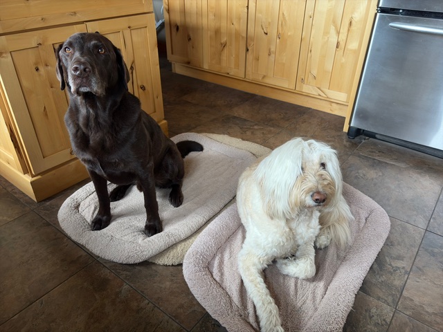 This is a photo of Jesse, a labrador, and Jordan the goldendoodle who live with